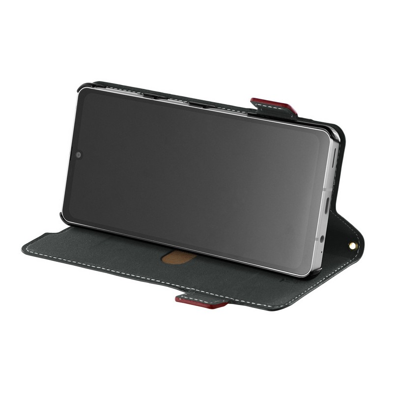サイドベルトがバイカラーになった遊び心ある手帳型ケース/ピタッと固定できるマグネット仕様/すぐ取り出せてかさばらないカード収納ポケット(1枚)/動画視聴に最適なスタンド機能/ストラップホール搭載