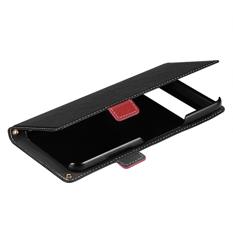 サイドベルトがバイカラーになった遊び心ある手帳型ケース/ピタッと固定できるマグネット仕様/すぐ取り出せて嵩張らないカード収納ポケット(1枚)/動画視聴に最適なスタンド機能/ショルダーストラップが使える2つのホール搭載