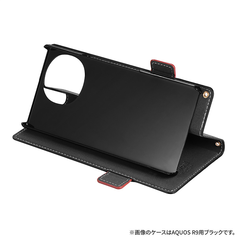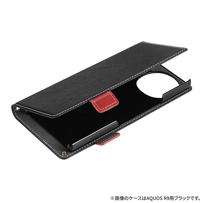 サイドベルトがバイカラーになった遊び心ある手帳型ケース/ピタッと固定できるマグネット仕様/すぐ取り出せて嵩張らないカード収納ポケット(1枚)/動画視聴に最適なスタンド機能/ショルダーストラップが使える2つのホール搭載
