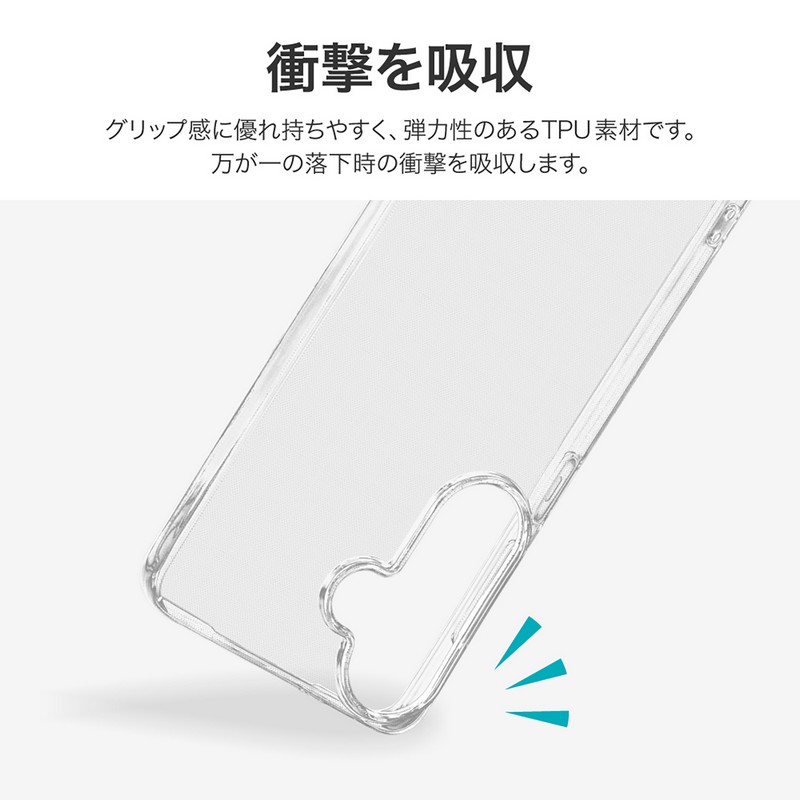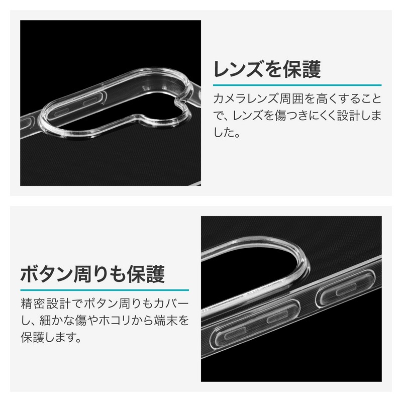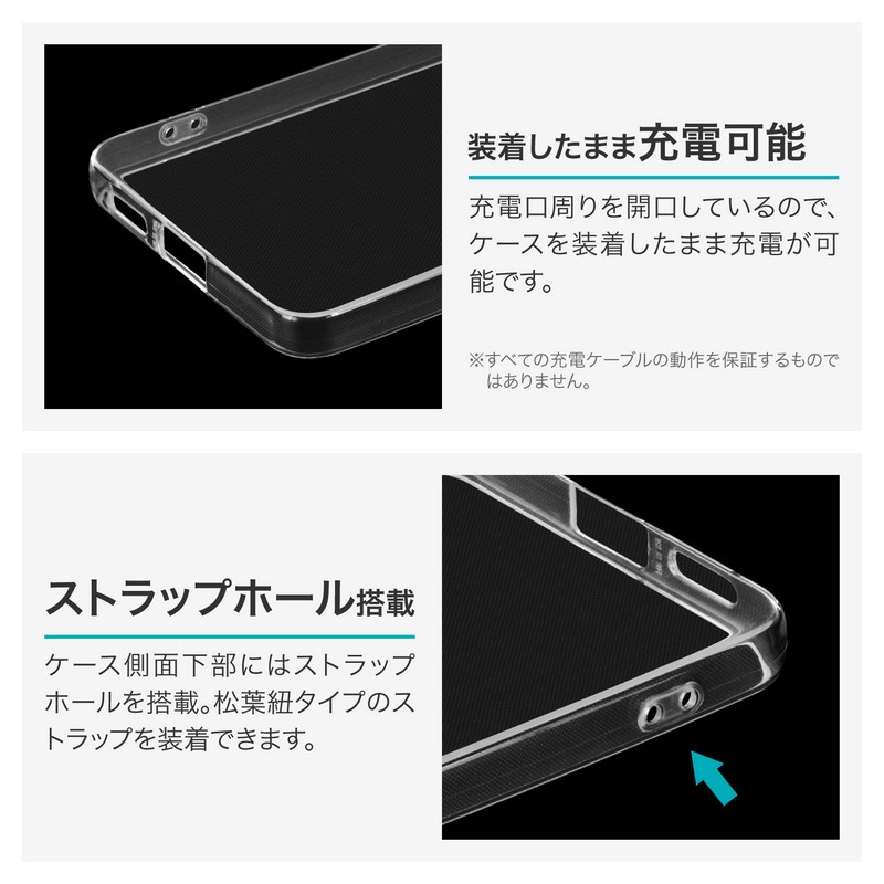 高透明で柔らかなTPUケース/柔軟性があり着脱が簡単/ボタンやカメラレンズ周りを保護/マイクロドット加工で端末に張り付きにくい/ストラップホール搭載