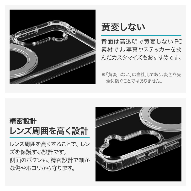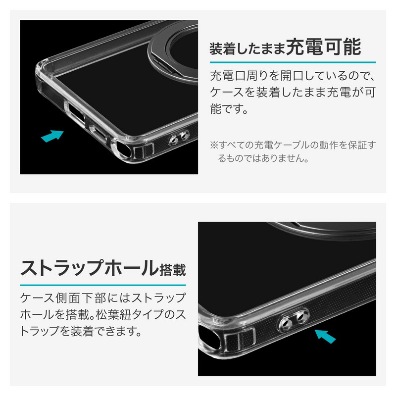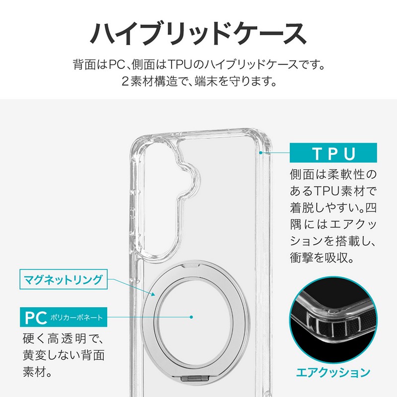 【耐衝撃】360度回転&スタンドになるリングを搭載/磁気アクセサリ対応/硬く高透明なポリカーボネートと、柔らかく耐衝撃性に優れたTPUのハイブリッドケース/角に衝撃を吸収するエアクッションを搭載/柔軟性があり着脱が簡単/ボタンやカメラレンズ周りを保護/ストラップホール搭載
