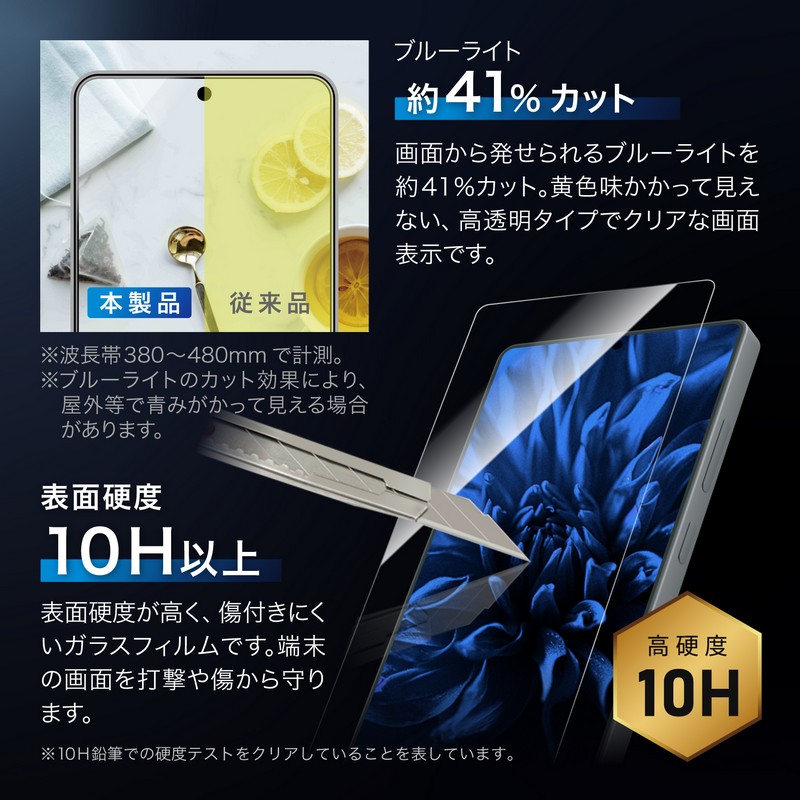 【貼り付けキットLite付属】【指紋認証対応】極薄0.25mm/超硬度10H表面強化ガラス/指紋防止効果2倍持続/黄色くならないブルーライトカット/ブルーライト約41%カット/高透明/アルコール洗浄布・ホコリ除去ラベル・クリーニングクロス付属