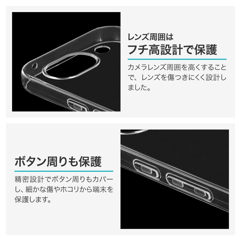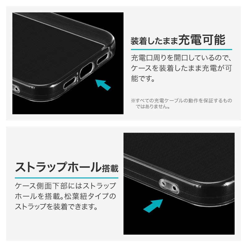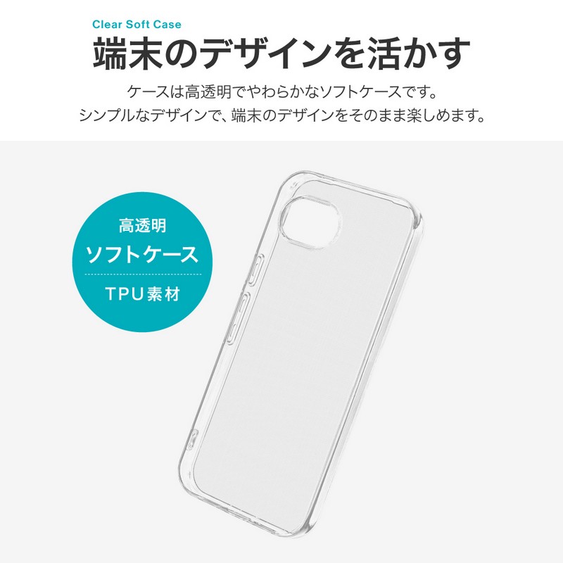 高透明で柔らかなTPUケース/柔軟性があり着脱が簡単/ボタンやカメラレンズ周りを保護/マイクロドット加工で端末に張り付きにくい/ストラップホール搭載