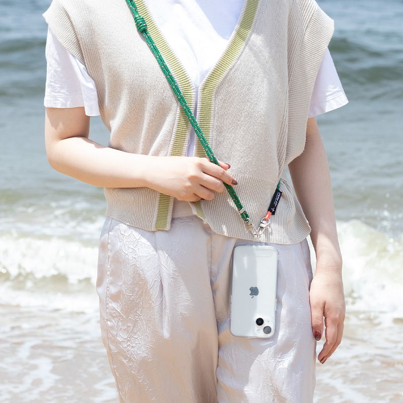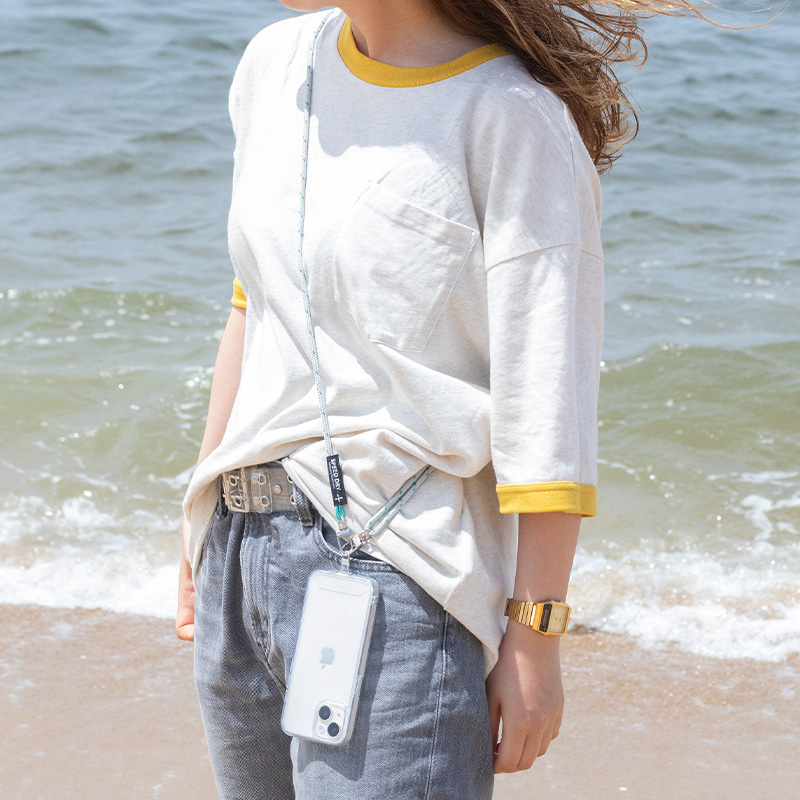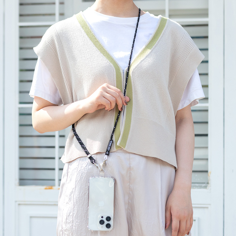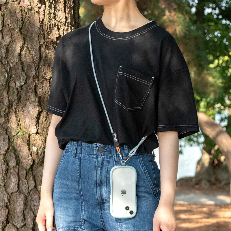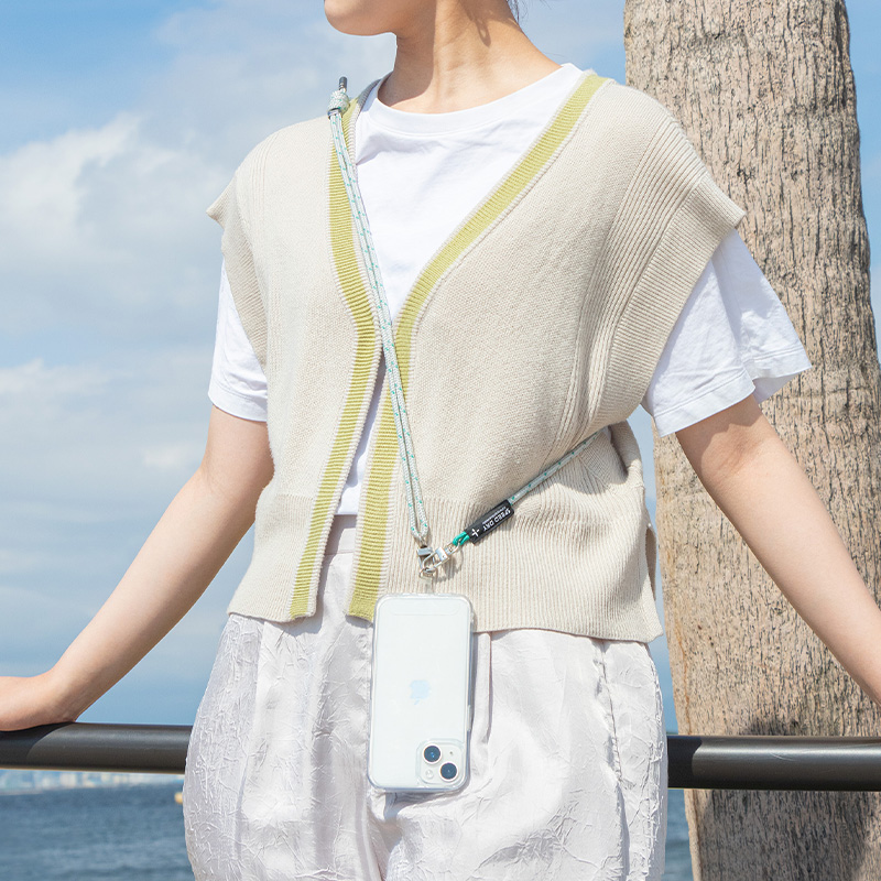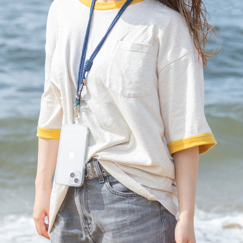 端末やケースを選ばず装着できる多機能ショルダーストラップ/付属の挟み込みシートで、ケースにストラップホールが無くても装着可能/水に濡れてもすぐに乾く速乾タイプ/カジュアルなバイカラー/長さ調整で首掛けor肩掛けが可能な2WAY仕様