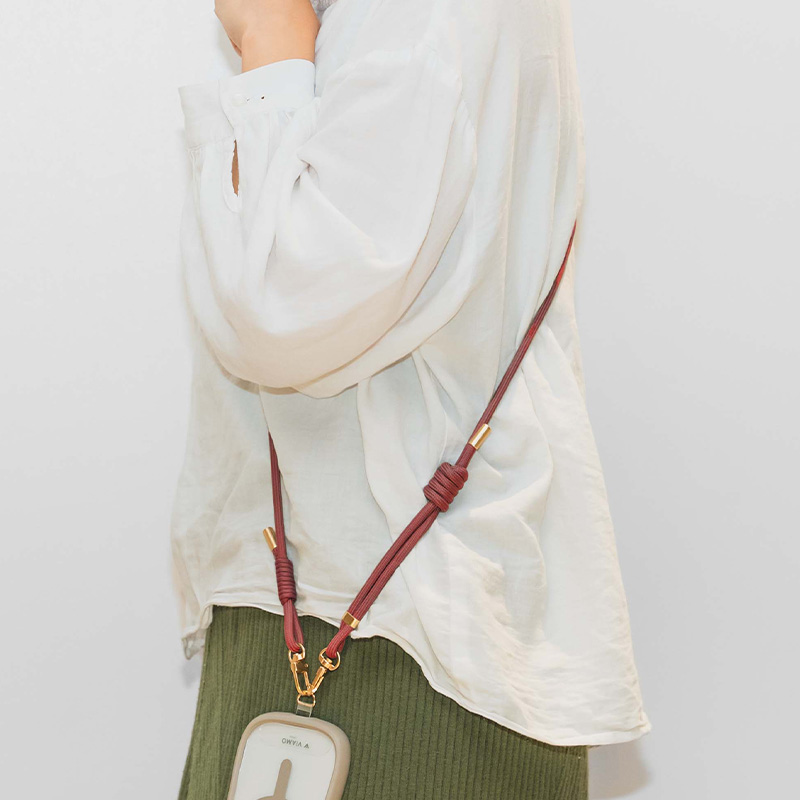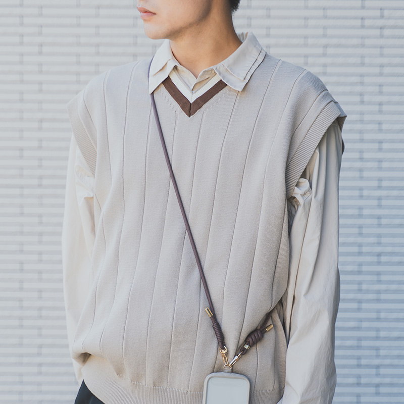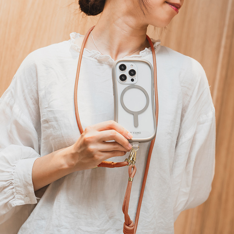 端末やケースを選ばず装着できるスマホショルダーストラップ/付属の挟み込みシートで、ケースにストラップホールが無くても装着可能/取り付け方が選べる2種類の挟み込みシート付属/シックなオータムカラー/長さ調整で首掛けor肩掛けが可能な2WAY仕様