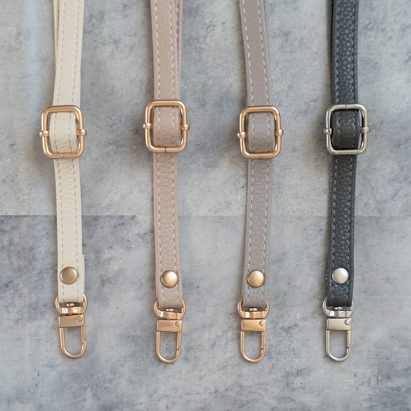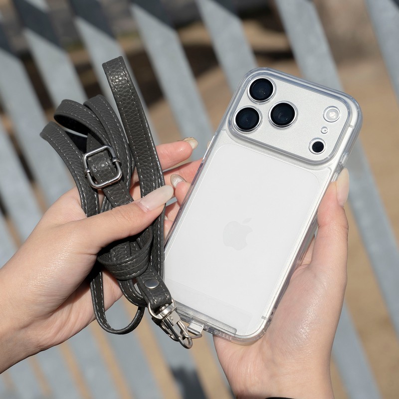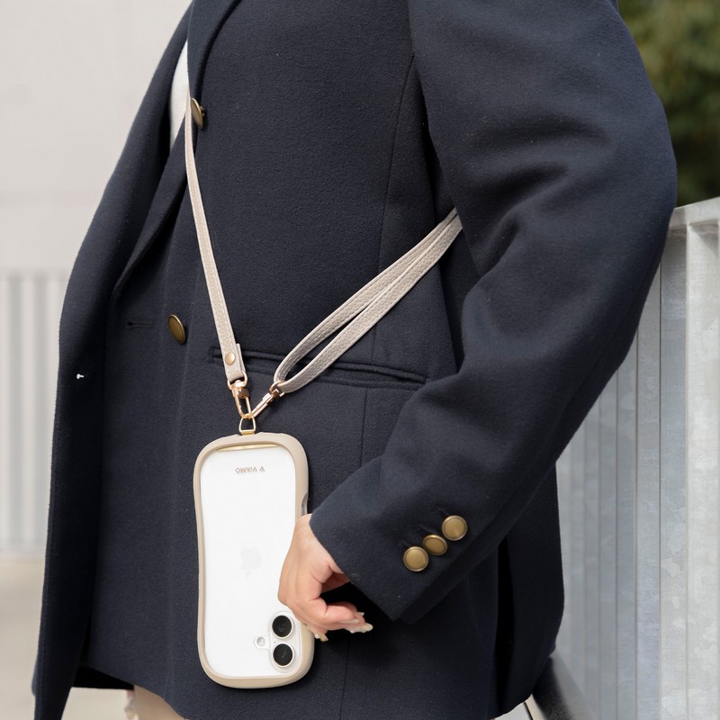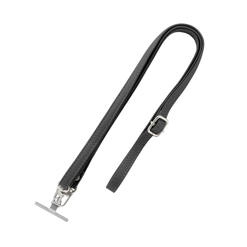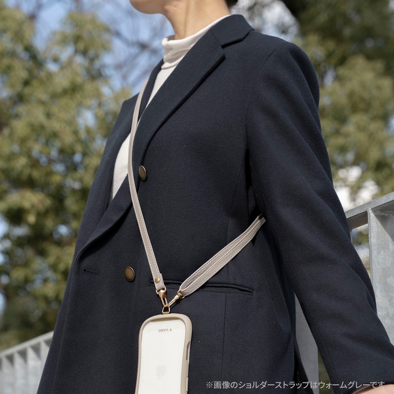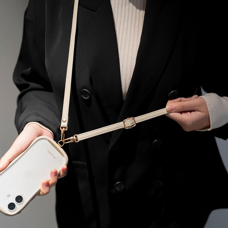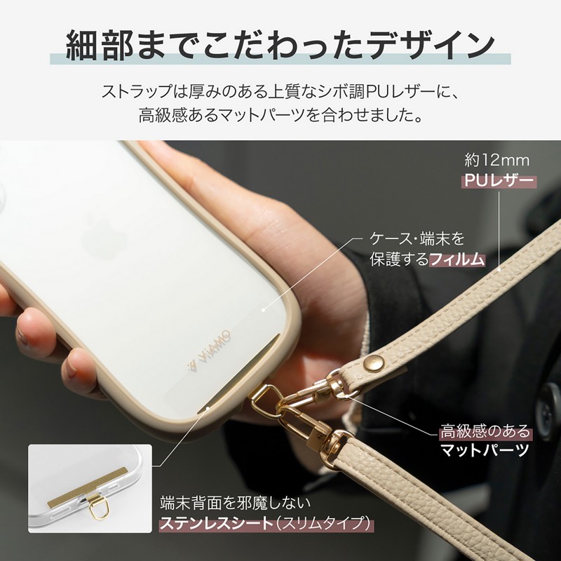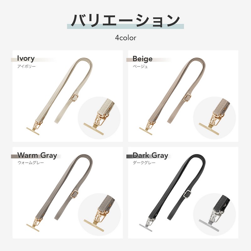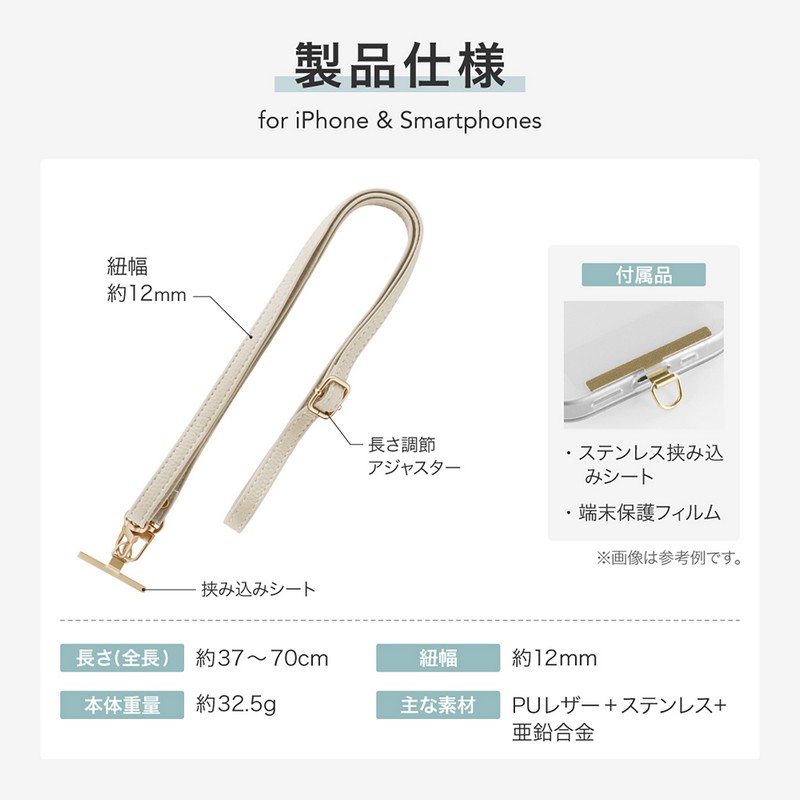 端末やケースを選ばず装着できるスマホショルダーストラップ/端末背面を邪魔しない、細身で頑丈なステンレス製挟み込みシート付属/長さ調整可能/厚みのある上質なシボ調PUレザー/ねじれにくいWフック/高級感あるマットパーツ/日常使いしやすいカラバリ