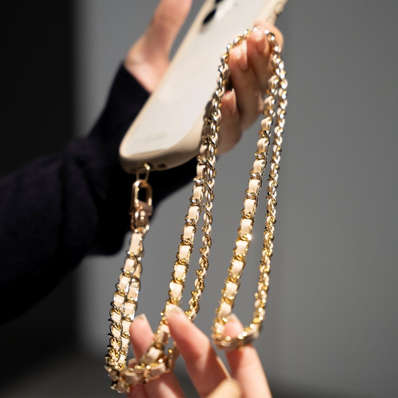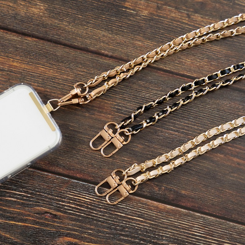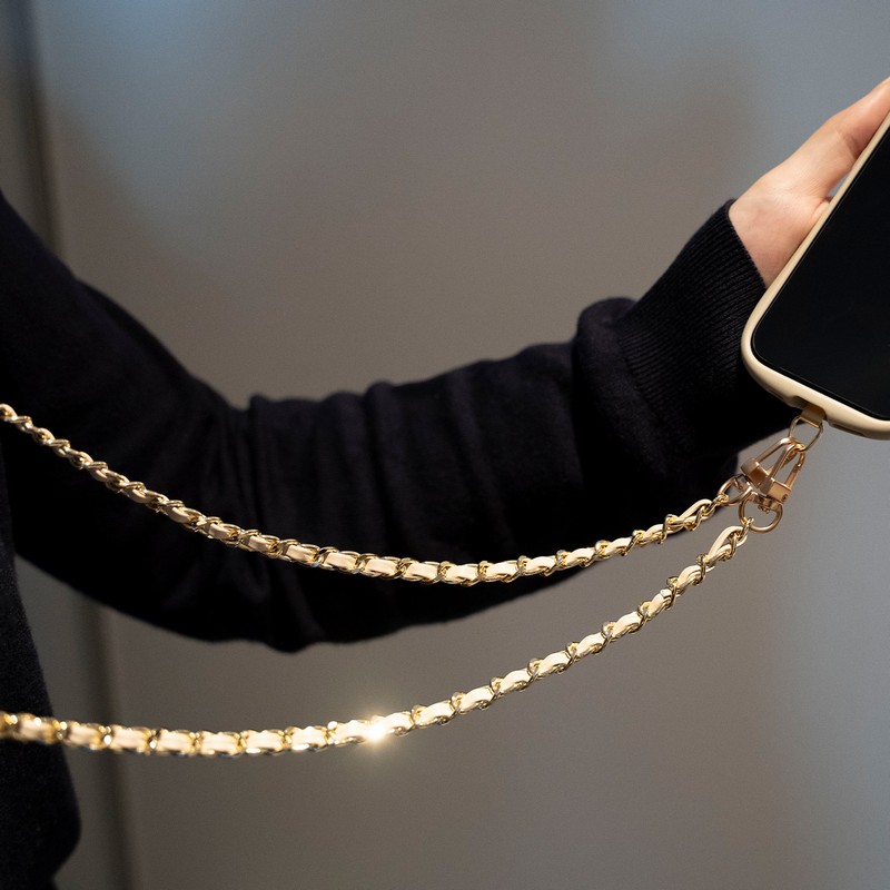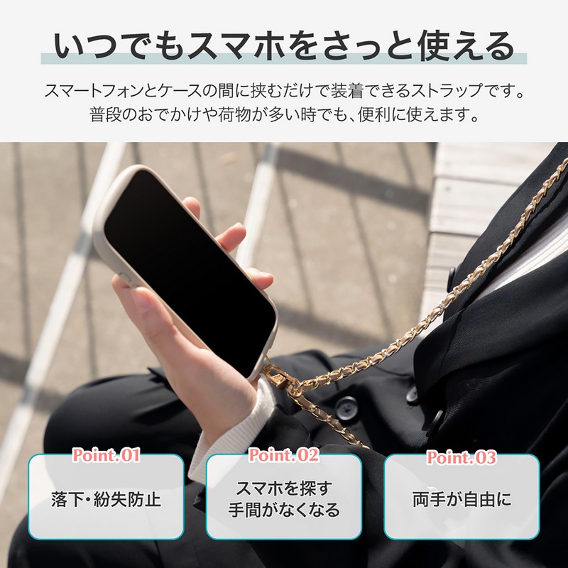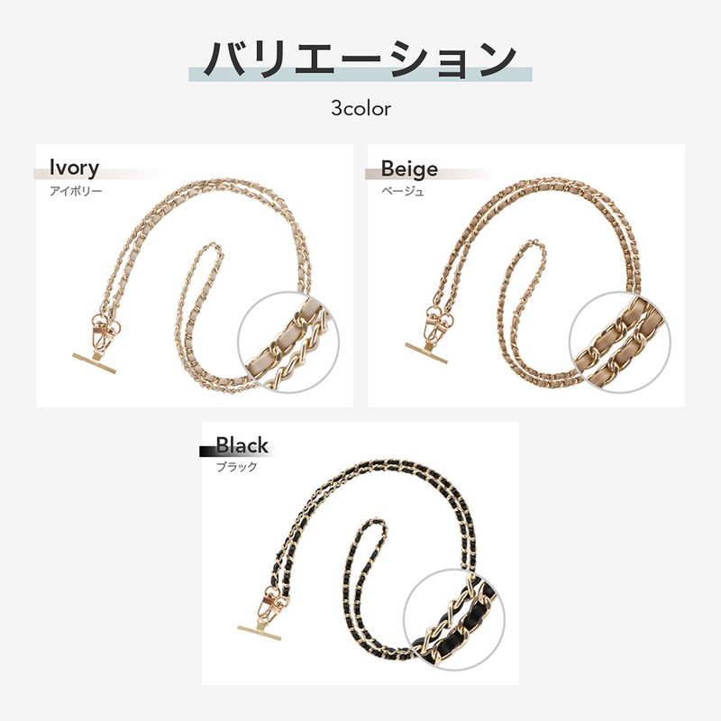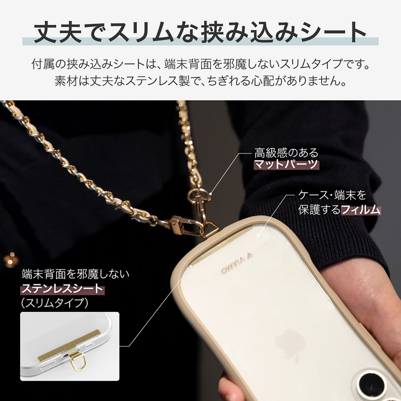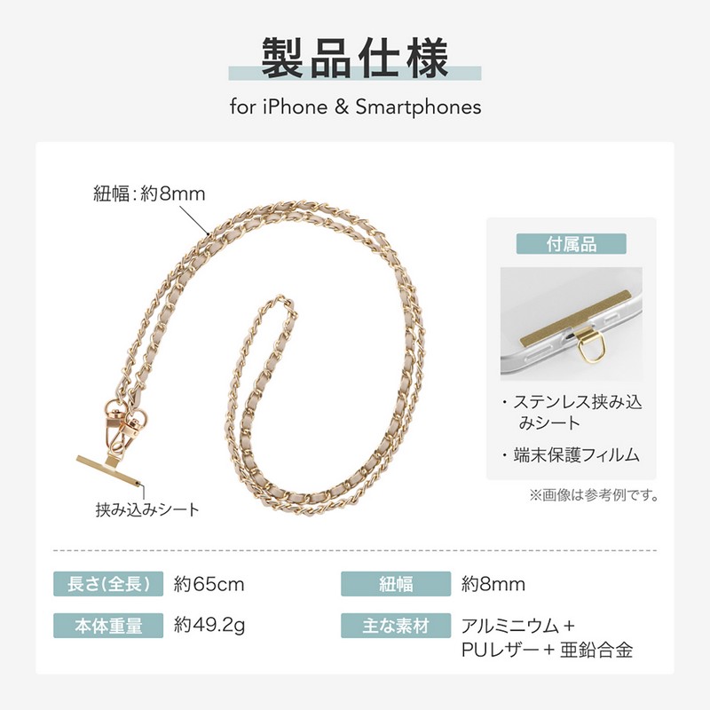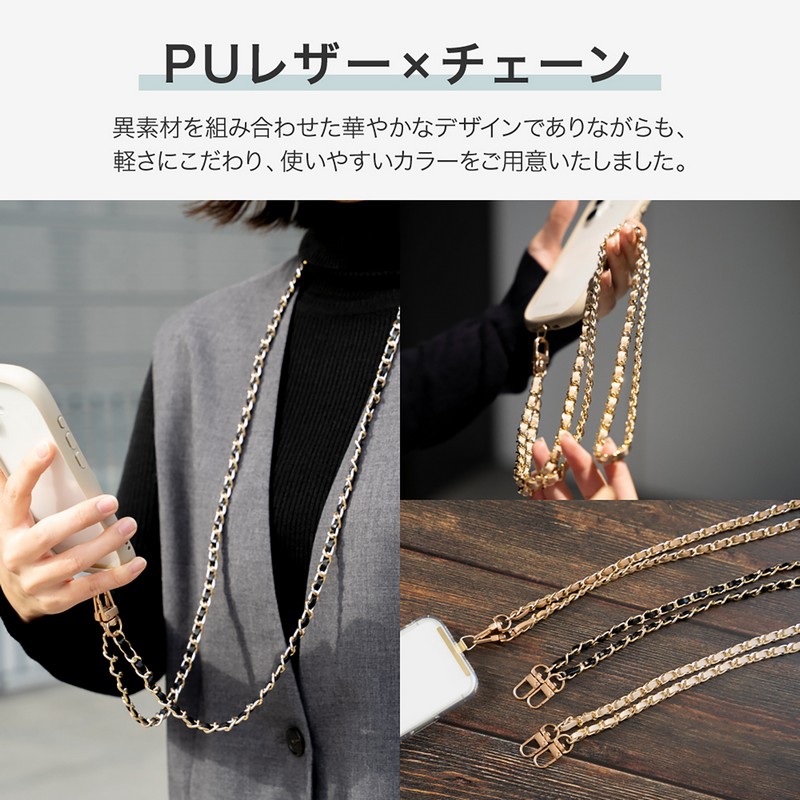 端末やケースを選ばず装着できるスマホショルダーストラップ/端末背面を邪魔しない、細身で頑丈なステンレス製挟み込みシート付属/軽さにこだわったPUレザー編み込みチェーン/ねじれにくいWフック/高級感あるマットパーツ(フック部のみ)/華やかながら使いやすいカラバリ