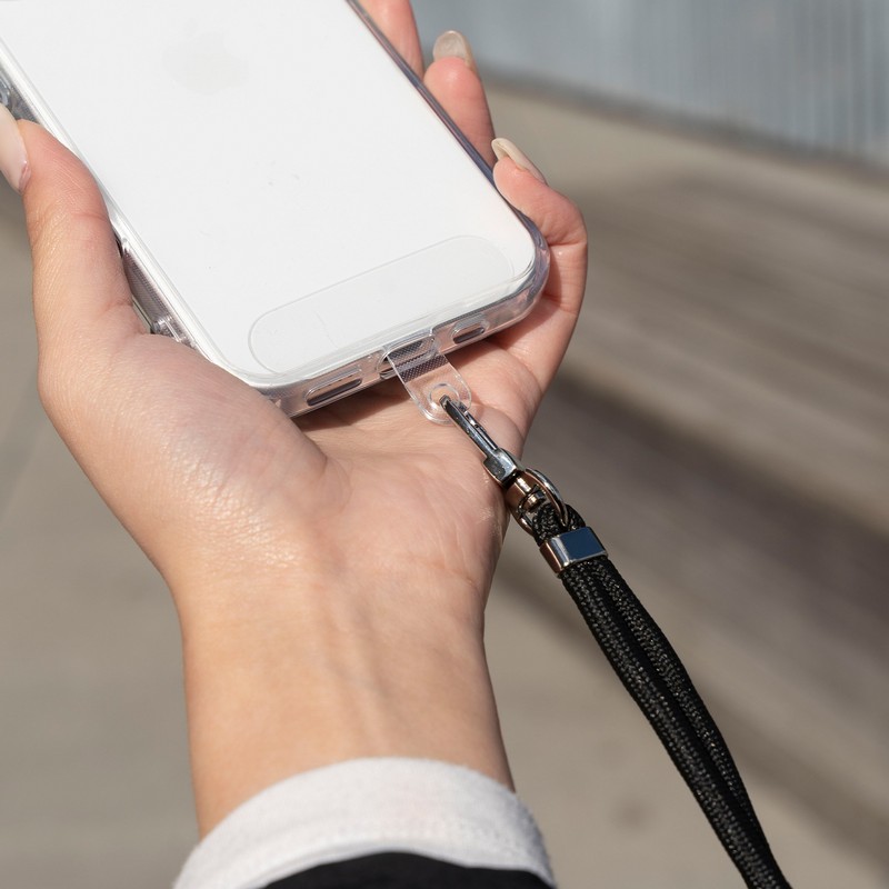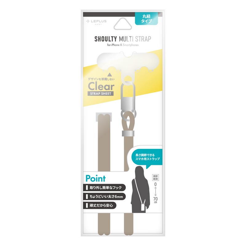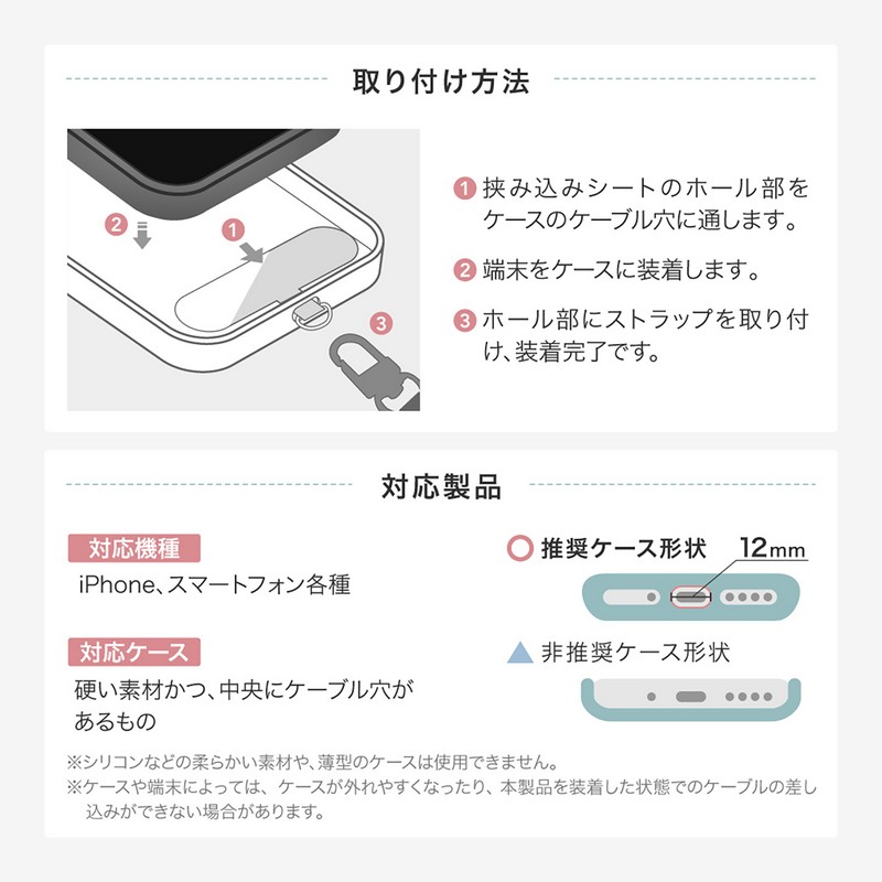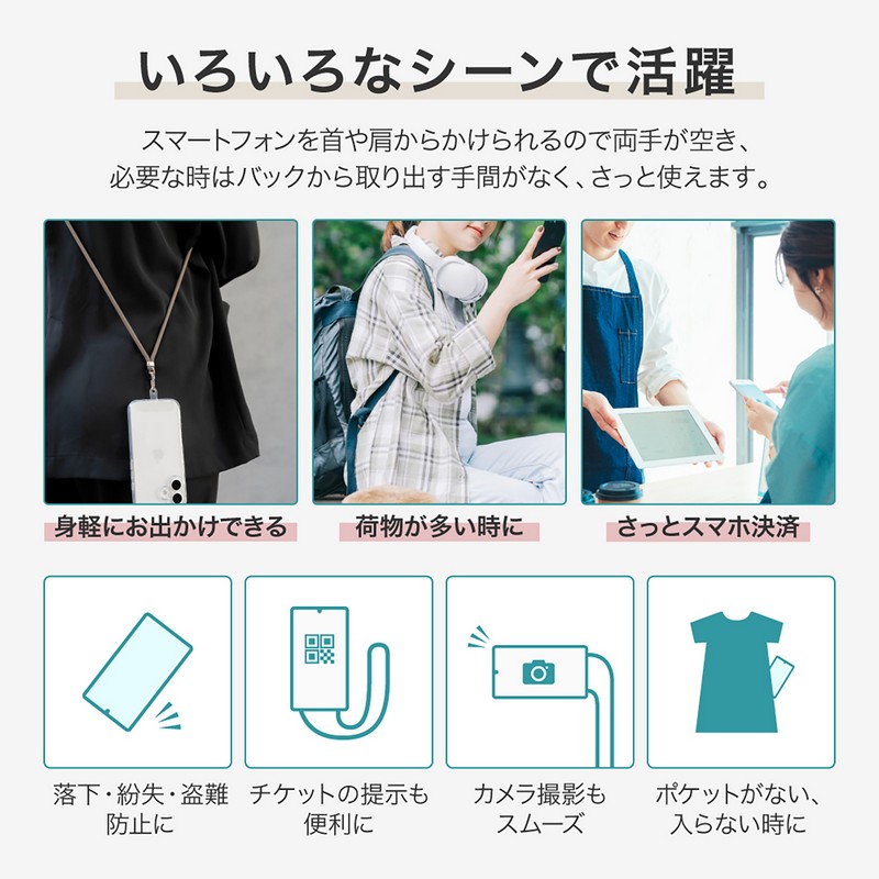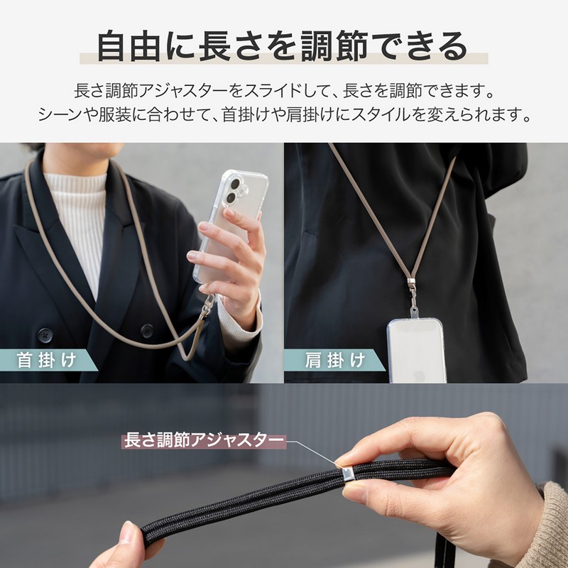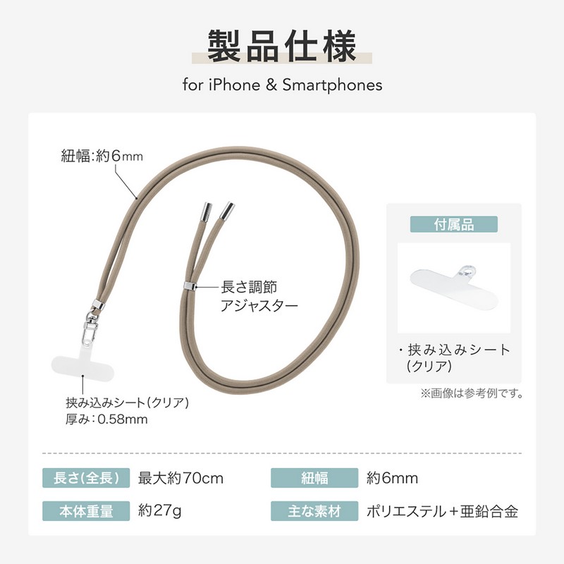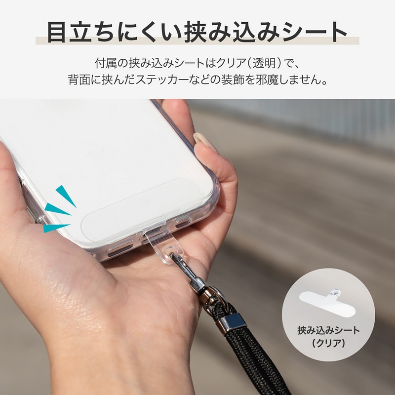 端末やケースを選ばず装着できるスマホショルダーストラップ/ステッカーなどの装飾を邪魔しない、クリアな挟み込みシート付属/長さ調整可能/しなやかなφ6mmコード