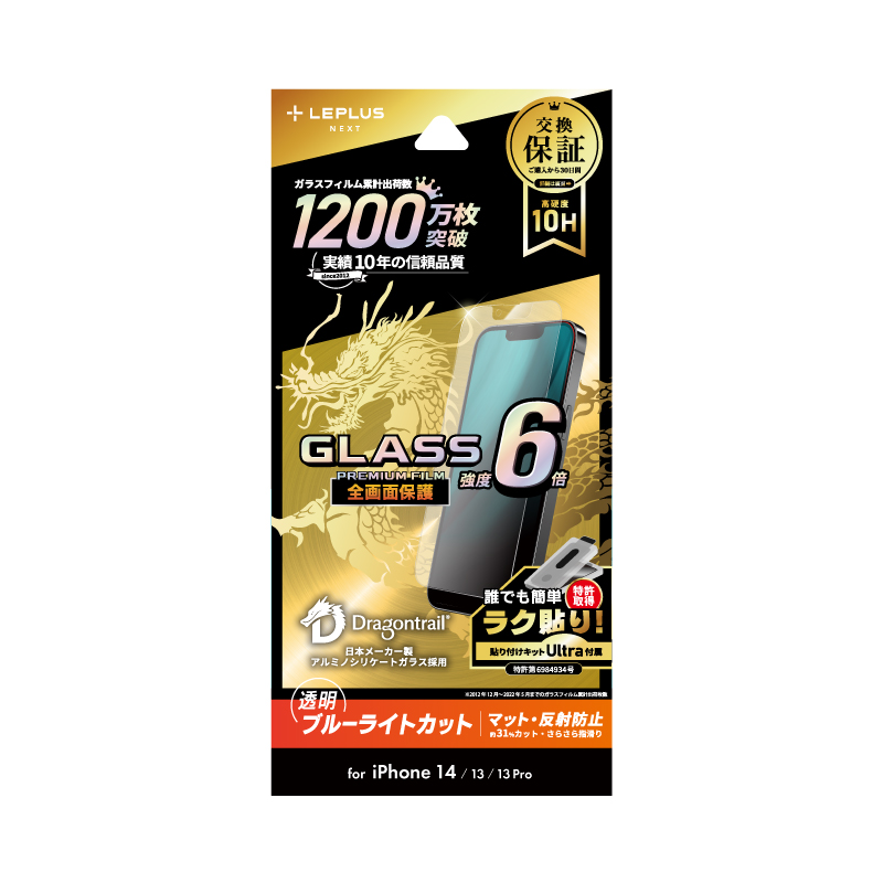 iPhone 14/13/13 Pro ガラスフィルム「GLASS PREMIUM FILM」 全画面保護 ドラゴントレイル マット・ブルーライトカット